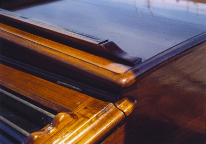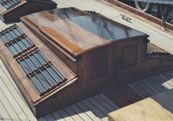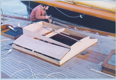 Working with the owner, great care was taken over the proportions of this hatch and its integral skylights. Other yachts (including Patna) were studied, and the moulding details and skylight bar holders were copied from the one remaining original skylight. The plywood mock-up (left) was part of the process.