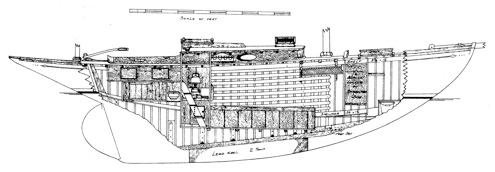 Over 20 years later, she came down south on a lorry for some serious refurbishment. She had had a completely new upper works in the 1960s. This was now beyond minor repair, and it was decided to return to her original cabin plan. This was never drawn by Albert Strange, but very fortunately existed in one of F B Cooke’s yachting books.