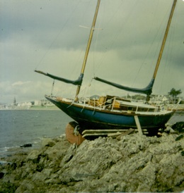 A mishap with a broken mooring in the 1970s. The later cabin and bermudan rig which served Ian and others well for many years can be seen in this photo.