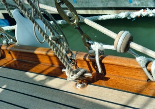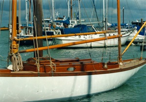 A view of the deck. The position of the jib sheet lead was only settled after several test sails. The topping lift is led to a ‘crosshead and eye’. These were cast in bronze by Colin Frake from an old one in my collection of yacht fittings. Colin also supplied all the blocks, deck and mast fittings.