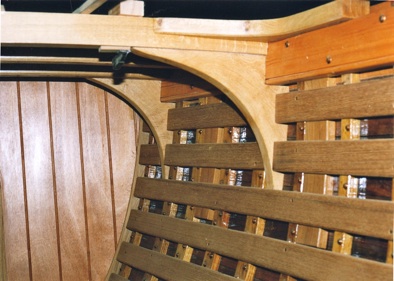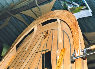Taffrail under construction. Venture was built about 1/4 mile from where my boat Firefly was built in Lowestoft, and 3 years earlier. In the absence of any other evidence, I felt justified in copying this method of carrying the rail around the counter stern.