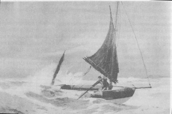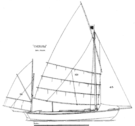The picture below is taken from Yachting Monthly, 1911. It was painted by Strange to illustrate an incident where Cherub II grounded briefly on Blakeney bar in Norfolk while attempting an entrance. It is blowing hard, and the picture shows well how the batwing mizzen has been furled, while the mainsail has all three reefs down snug, facilitated by the full length battens.
