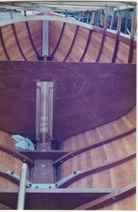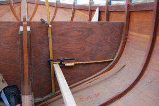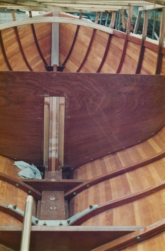 The hull is Western Red Cedar, strip-planked on laminated Sapele frames. The hull is sheathed externally with glass cloth and epoxy (which currently has a layer of peel-ply covering it). The interior is sealed with 2 coats of epoxy resin.