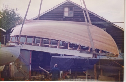 The hull of ‘Cherub 2 1/2’ is lifted out of the shed, and turned over
